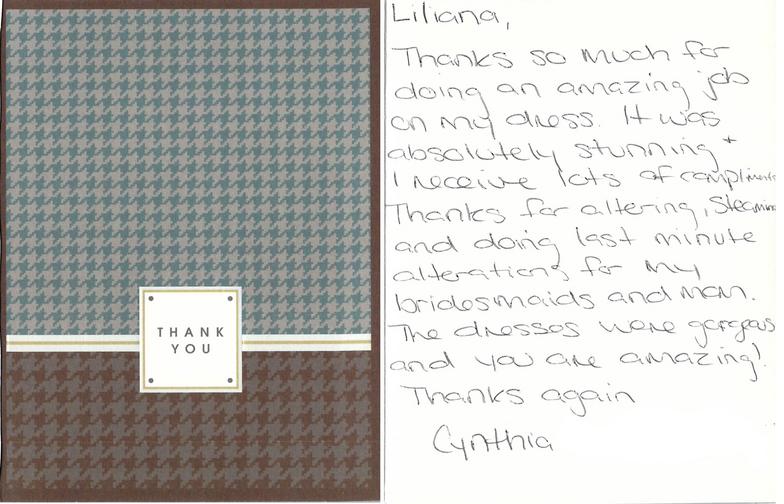 On behalf of myself, my husband and our daughter Lia, we'd like to thank you for all of your hard work with Lia's grad dress alterations.